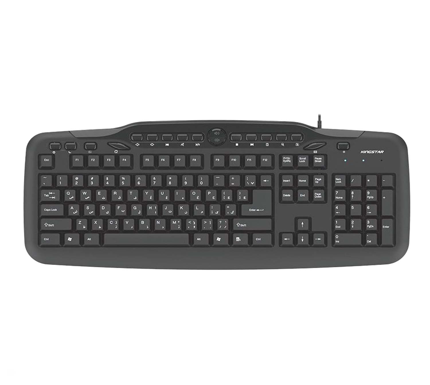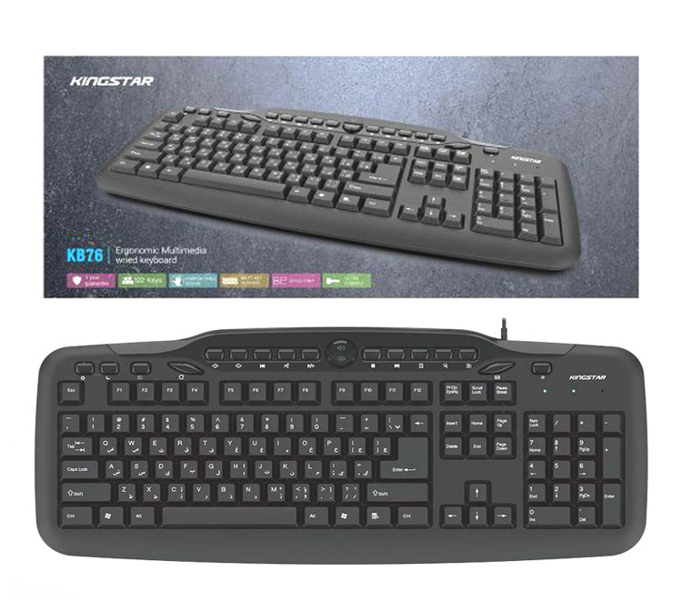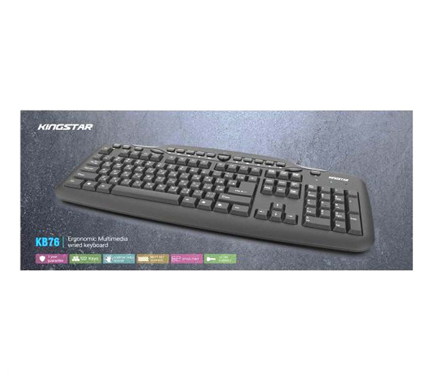 کیبورد کینگ استار مدل kb76 از نوع سیم دار میباشد و از طریق درگاه USB به کامپیوتر متصل میشود. این کیبورد دارای 122 کلید برای انجام فعالیتهای کامپیوتری است. همچنین کیبورد kb76 دارای 18 کلید میانبر به منظور انجام سریعتر کارهاست که عبارتند از Search, Dormant, Refresh, Back, Forward, Power, E-mail, Music, Play/Pause, Pre Track, Next Track, Volume +-, Web Home, My Computer. کیبورد کینگ استار مدل kb76 برای استفادههای روزمره مناسب میباشد. از دیگر ویژگیهای این کیبورد محصول کمپانی کینگ استار، طراحی کلیدها به گونهای که امکان تایپ کردن در مدت زمانی طولانی را فراهم می کند، دسترسی راحت به تمامی کلیدهای کاربردی، طراحی نرم و سایلنت کلیدها، با دوام و دارای کلیدهای مات میباشد. امروزه محصول Kb76 کمپانی کینگ استار به دلیل داشتن کلیدهای بی صدا هنگام تایپ توجه بسیاری را به خود جلب کرده و همین امر موجب شده تا به یکی از پرفروش ترین محصولات کینگ استار تبدیل شود.