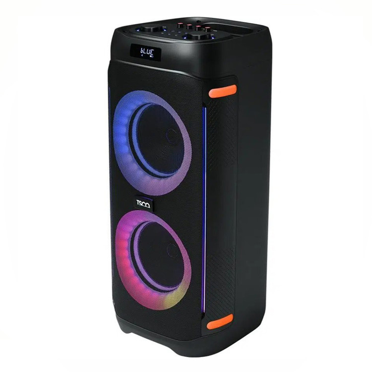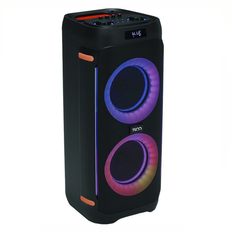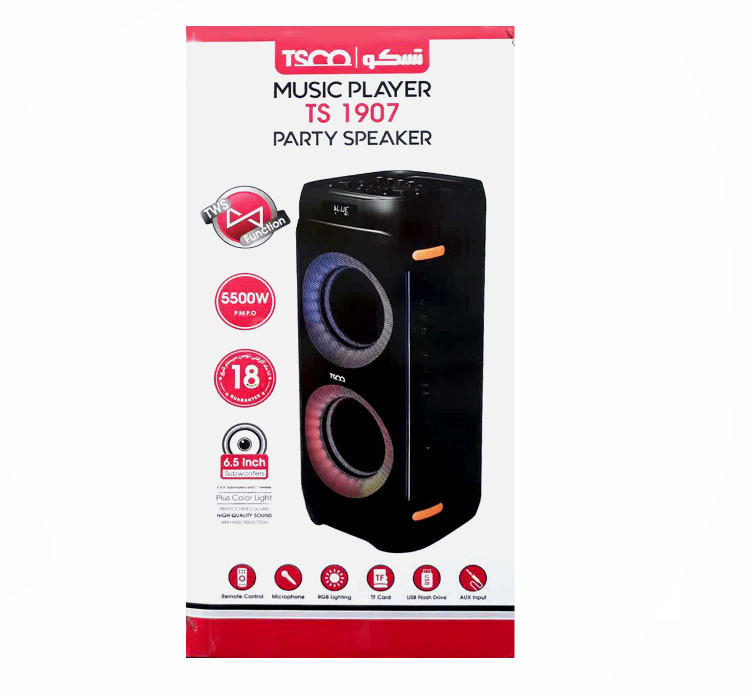اسپیکر TS 1907 با توان واقعی 40 وات RMS و پشتیبانی از PMPO معادل 5500 وات طراحی شده که نشاندهنده قدرت پخش صدای بالا و گسترده آن است. دو ووفر 6.5 اینچی و یک تیوتر 3 اینچی در این مدل استفاده شدهاند که ترکیبی مناسب از قدرت باس و وضوح فرکانسهای بالا ایجاد میکنند. باتری داخلی دستگاه با ظرفیت 4000 میلیآمپر ساعت از نوع لیتیوم، در صورت استفاده مستقل از برق شهری، توانایی پخش صدا با زمان متغیر را دارد 1907 به بلوتوث نسخه 5.3 مجهز شده است؛ نسخهای که نسبت به نسلهای پیشین، پایداری اتصال بالاتر، سرعت جفتشدن سریعتر و مصرف انرژی کمتری دارد. این مدل با ورودیهای USB، کارت حافظه TF، کابل AUX و رادیو FM عرضه شده که همگی بهصورت مستقیم روی دستگاه فعال میشوند.تنظیمات اکو، دیلی، باس و تریبل، از طریق کلیدهای اختصاصی روی بدنه در دسترس هستند. وجود قابلیتهایی مانند MIC Priority (اولویت میکروفن)، TWS برای اتصال همزمان دو اسپیکر، Vocal Cut برای حذف صدای خواننده، و حالت ضبط (REC)، این مدل را به یک مرکز کنترل صوتی سیار تبدیل میکند. این امکانات بهویژه در اجراهای زنده، جلسات گروهی یا مراسم خانگی، کاربرد بسیار زیادی دارند. همراه دستگاه، یک میکروفن بیسیم با فرکانس 2.4 گیگاهرتز عرضه میشود که بدون نیاز به کابل، به سرعت به اسپیکر متصل میشود. این اسپیکر با ابعاد 30×30×64 سانتیمتر طراحی شده که در دستهی اسپیکرهای قابلحمل ایستاده قرار میگیرد. وزن خالص 7.7 کیلوگرمی، آن را از نظر حملپذیری در محدوده قابل قبول نگه میدارد. 1907 به رقص نور داخلی نیز مجهز است که در هنگام پخش موسیقی فعال میشود. این نورها با ریتم آهنگ هماهنگ بوده و فضای شنیداری را با جلوههای بصری ترکیب میکنند. تمامی کلیدها و درگاهها روی یک پنل مرکزی قرار دارند که در دسترس و قابل تشخیص طراحی شدهاند. ولومها، کلیدهای تنظیم اکولایزر، پخش/توقف، ورودی میکروفن و حتی سوئیچ فعالسازی قابلیتهایی مانند Vocal Cut یا TWS، بهصورت مرتب و دستهبندیشده روی پنل جلویی چیده شدهاند. در بخش فوقانی پنل کنترل، یک نمایشگر دیجیتال کوچک قرار دارد که وضعیت پخش، حالت ورودی فعال، و سطح صدا را نشان میدهد.