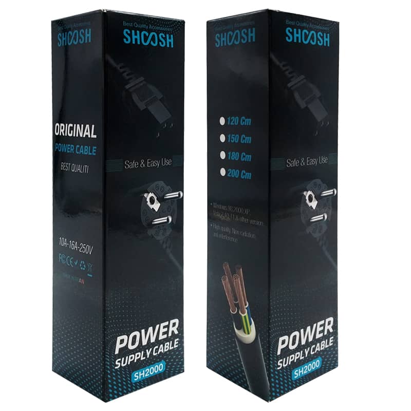 کابل برق سه پین منبع تغذیه شوش مدل SH200 کابلی با کیفیت و طول استاندارد برای اتصال به پاور کامپیوتر یا مانیتور کامپیوتر شماست. این محصول با طول 150 سانتی متر، به خوبی میتواند نیاز شما را پاسخگو باشد. این کابل برق کامپیوتر، یک رابط از نوع دوشاخه می باشد که در پریز های معمولی و استاندارد ایرانی قابل استفاده است و برق را با جریان عبوری 10 تا 16 آمپر و ولتاژ 250 به کامپیوتر می رساند. این محصول دارای روکشی انعطاف پذیر از جنس پلاستیک بوده و سیم های داخلی کابل نیز از مس ساخته شده اند. این کابل برق 1.5 متری از کیفیت بالایی برخوردار است و برای تمامی سیستم عامل ها قابل استفاده است.