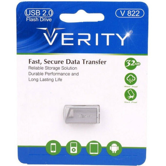 فلش مموری وریتی مدل V822 ظرفیت 32 گیگابایت، یکی از پرفروشترین فلش مموریهای وریتی است. این فلش مموری به دلیل اندازه کوچک و جنس بدنه فلزی و مقاوم در برابر ضربه و فشار، به راحتی قابل حمل در هر مکانی است. این فلش با سیستم عاملهای ویندوز و مکینتاش سازگاری دارند. همچنین دارای حلقهای در انتهای بدنه و قلاب ظریف فلزی برای وصل کردن به آن است و یا اینکه میتوانید به جاکلیدی وصل کنید که حمل و نگهداری این فلش را راحتتر میکند. این فلش مموری دارای رابط اتصال USB2.0 است.