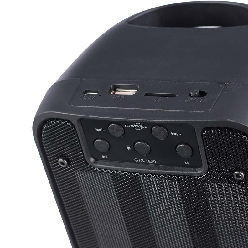 اسپیکر بلوتوثی بی سیم قابل حمل Greatnice GTS-1839 با پشتیبانی از فلش مموری USB و کارت حافظه Micro SD تا حداکثر حجم 32 گیگابایت، گزینهای عالی برای پخش فایلهای ذخیره شده شماست. این اسپیکر از باتری داخلی با امکان شارژ مجدد از طریق درگاه Micro USB بهره میبرد و ولتاژ شارژ 5 ولت DC دارد. بدنه پلاستیکی مقاوم در برابر ضربه و فشار احتمالی و نورپردازی RGB، جلوه بصری زیبا به اسپیکر میبخشد.دارای کلید های فیزیکی برای مدیریت موسیقی، ولوم، Mode و …