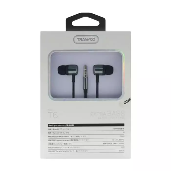 هندزفری مدل T6 برند ترانیو، به صورت باسیم و با کابلی به طول 120 سانتی متر طراحی شده است و توسط رابط جک صوتی 3٫5 میلی متری (AUX) به گوشی های موبایل و دیگر دستگاه های سازگار متصل می شود. جنس روکش این سیم از پلاستیک TPE با انعطاف مناسبی ساخته شده که در برابر کشیدگی، خمیدگی و گره خوردن مقاومت بالایی نشان می دهد. تو گوشی های آن با حالت زاویه دار به راحتی در داخل گوش جای می گیرند و سر و صداهای محیط در هنگام گوش دادن به موسیقی، شنیده نخواهند شد و همچنین طی استفاده طولانی مدت، ایرفون ها باعث خستگی و فشار بر روی گوش کاربر نمی شوند. هندزفری سیمی Tranyoo مدل T6 با فرکانس پاسخگویی 18 هرتز تا 20 کیلو هرتز، حساسیت سیگنال به نویز 116 دسی بل و امپدانس 32 اهم، صدایی استریو با وضوح HD و Extra Bass را به گوش می رساند. میکروفون داخلی نیز تعبیه شده تا تماس های شفاف و بدون نویزی را برقرار نمایید. روی کابل آن یک پنل از دکمه های فیزیکی قرار دارد تا مدیریت راحت تری بر عملیات هایی مانند برقراری تماس، میزان حجم صدا، پخش موسیقی و … داشته باشید.