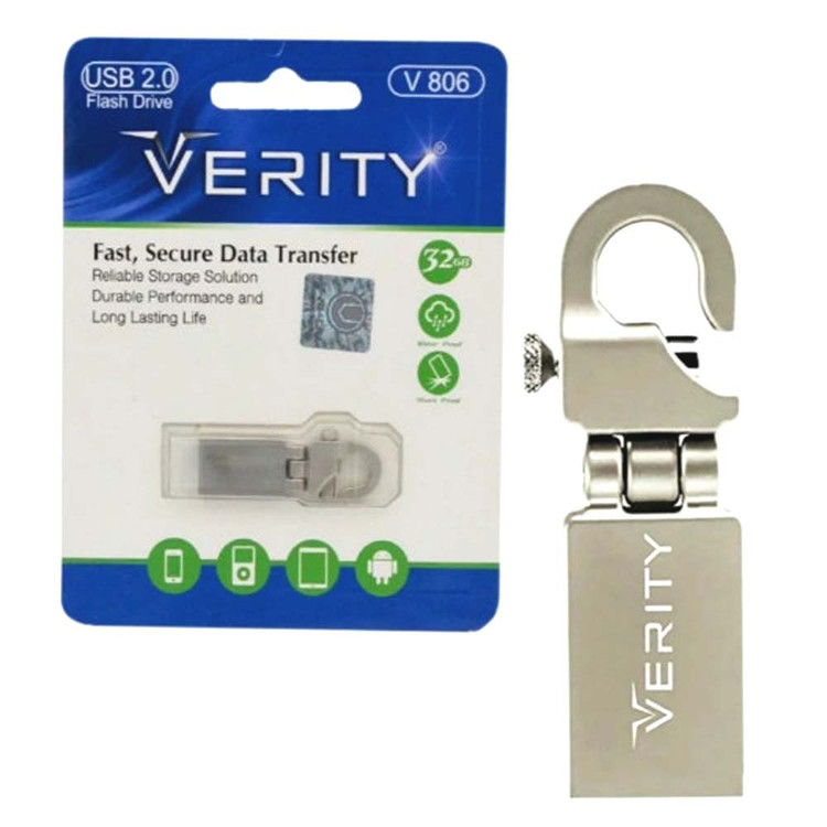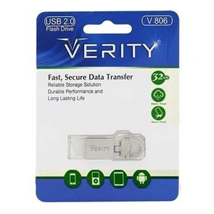 محصولی که هم اکنون در اختیار ماست فلش مموری مدل Verity V806 USB2.0 با ظرفیت 32 گیگابایت است. این فلش مموری از رابط USB2.0 بهره می برد و قادر است که اطلاعات را با سرعت حداکثر تا 480 مگابیت بر ثانیه جا به جا کند. جنس بدنه فلش مموری مدل V806 وریتی از فلز مقاوم تشکیل شده و در برابر آب ، شوک و لرزش و همچنین نفوذ گرد و غبار به داخل فلش مموری مقاوم است.