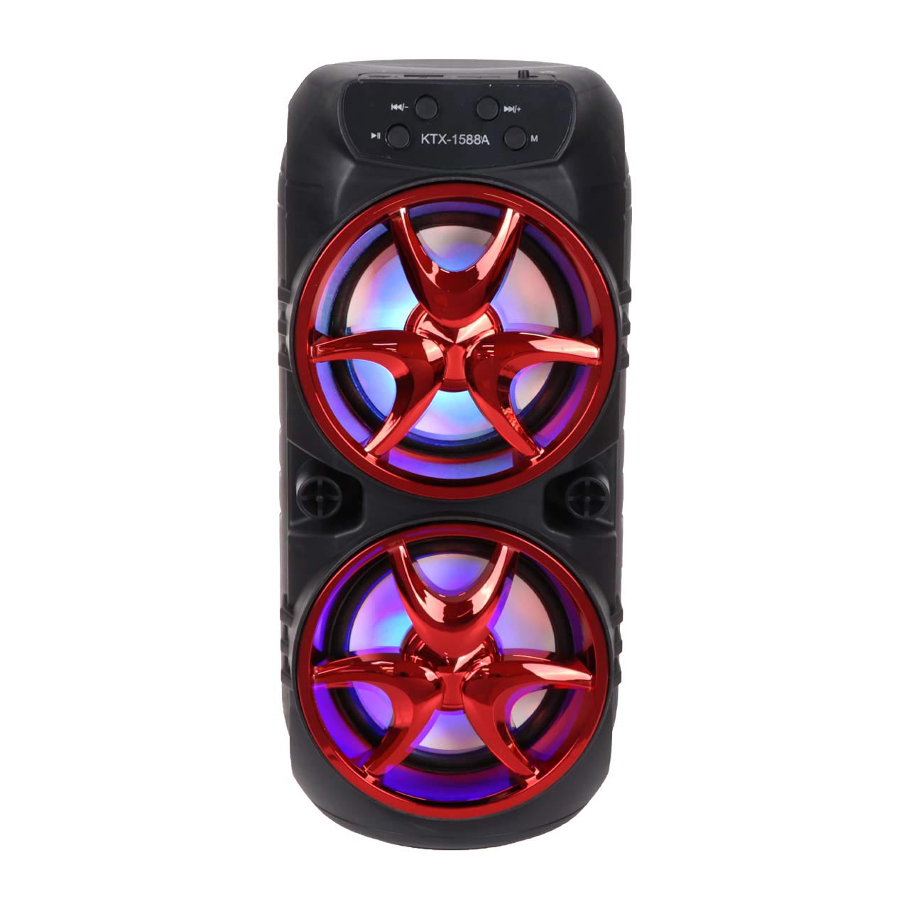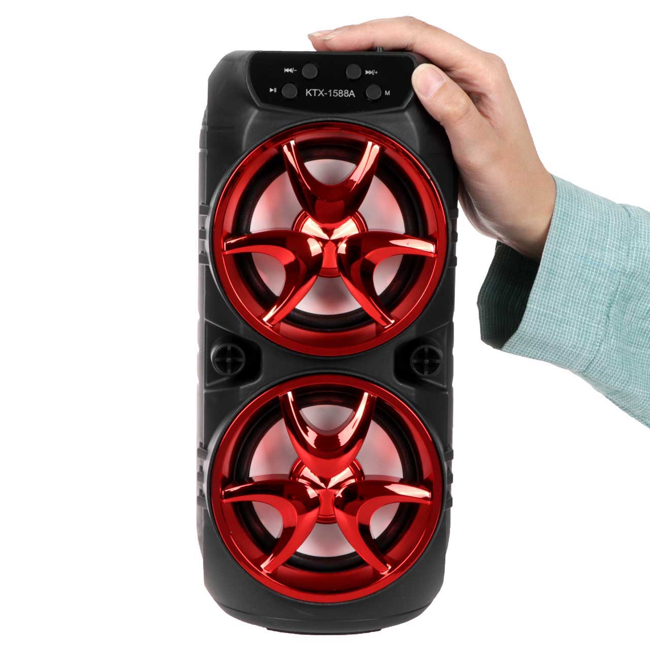 اسپیکر مدل KTX 1588A با داشتن دو بلندگوی 3 اینچی با ابعاد 10*10*25 سانتی متر ، یک پرتابل اسپیکر با وضوح صدای مناسب برای مکانهای کوچک است که با ابعاد و وزن مناسبی که دارد قابلیت جابجایی راحت و استفاده در مکان های مختلف را برای شما فراهم میکند تا بتوانید از طریق بلوتوث / مموری کارت و یا فلش موزیک دلخواهتان را اجرا کنید و از شنیدن صدای آن لذت ببرید. داخل هر دو باند این اسپیکر چراغهای LED رنگی قرار دارد که زیبایی بیشتری به این اسپیکر می بخشد. باطری 1200 میلی آمپر اسپیکر تا بیش از 3 ساعت پخش موزیک با صدای بلند را برای شما فراهم میکند و برای شارژ کامل باطری 2ساعت زمان نیاز دارد. این اسپیکر رادیو FM هم دارد که به کمک دکمه ها باید موجهای رادیو بصورت خودکار فعال شود.