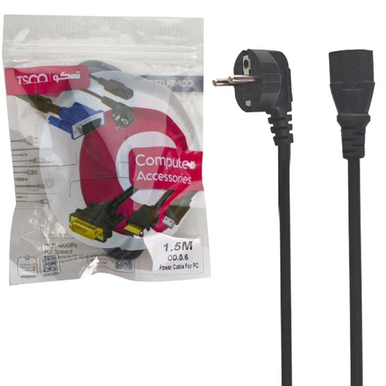 کابل برق TSCO به طول 1.5 متر به کانکتور خروجی که به یک شیار3تایی مادگی مجهز شده است و امکان اتصال به پورت کیس و مانیتور را فراهم می سازد و همچنین در سمت دیگر آن یک دو شاخه برق تعبیه شده که می توانید مستقیما به پریز برق نیز متصل نمائید. این کابل بدلیل خلوص مس استفاده شده در تولید رشته ها ، افت ولتاژ بسیار ناچیزی دارد و همچنین به دلیل کیفیت بالای رشته ها و ضخامت کابل ، مانع داغ شدن و آسیب رسیدن به تجهیزات الکترونیکی می شود و برای مصارف خانگی و صنعتی مناسب است. این کابل در برابرکشش، پارگی و گره خوردن مقاوم است و قابلیت ضد تداخل و بدون تشعشع و جلوگیری از الودگی الکترومغناطیسی را دارد.همچنین دوشاخه برق و سرسوکت کامپیوتری آن کاملا تو پر و فشرده است که مانع از ذوب شدن آن در شدت جریان های بالا می شود.