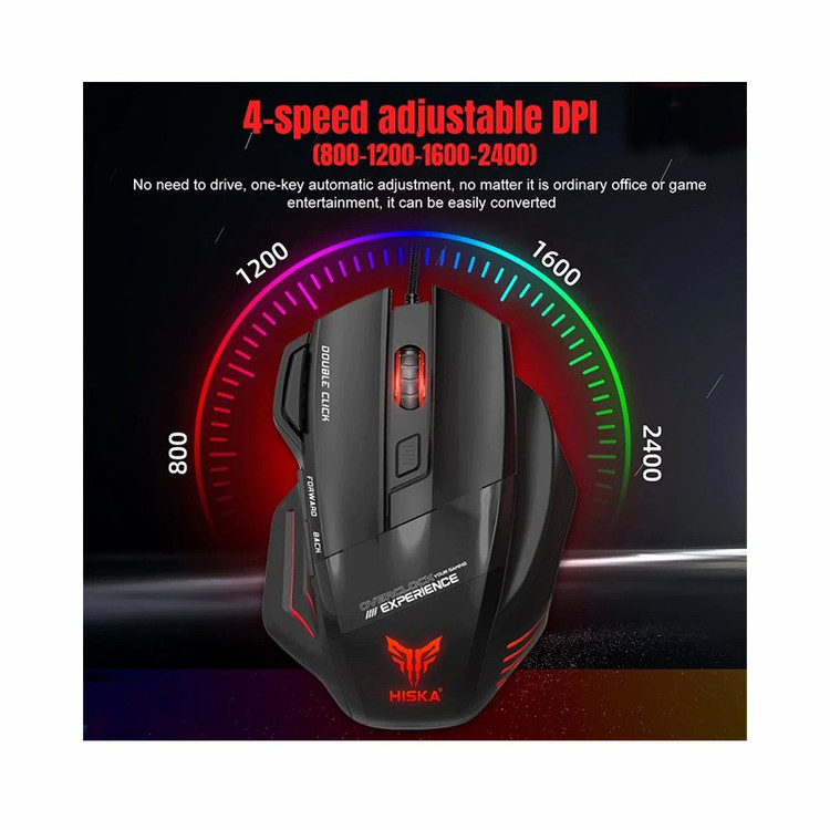 ماوس سیم دار هیسکا مدل HX-MOG310 ویژه بازی های ایده آل کامپیوتری شما گیمر های عزیز.این محصول با یک کابل روکش کنفی به طول 180 سانتی متر و رابط USB به سیستم دیجیتال شما وصل می شود.دارای7 عدد کلید با قابلیت های متفاوت و 5 افکت نورپردازی متفاوت می باشد.از ویژگی خاص این ماوس دکمه Double Click آن است که به شما این امکان را میدهد که با یکبار کلیک کار دوبار کلیک کردن را انجام دهید.