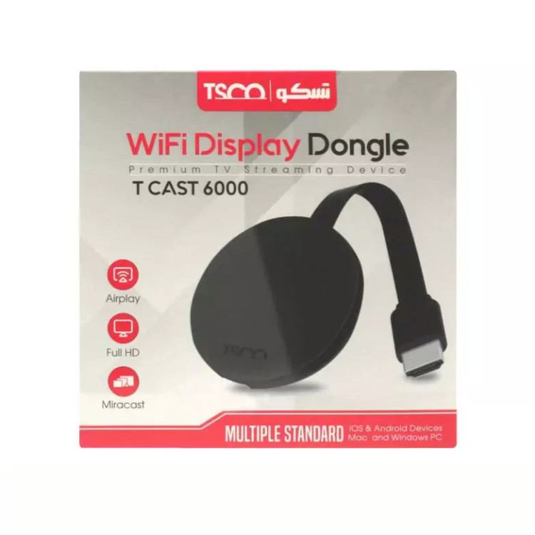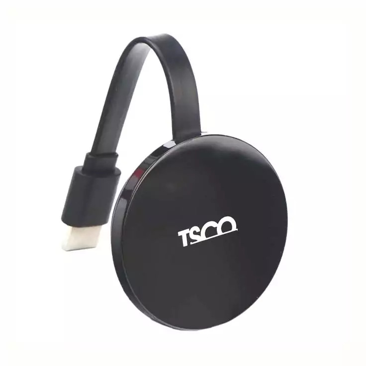 دانگل HDMI که به دانگل انتقال تصویر بی سیم وایرلس یا دانگل انتقال موبایل به تلویزیون هم معروف است، به دستگاهی گفته میشود که از طریق رابط HDMI به صفحه نمایش وصل شده و توسط آن میتوانید اطلاعاتی مانند فیلم، عکس، فایل صوتی و … را از موبایل، تبلت و لپتاپ را به صورت بیسیم به صفحه نمایش انتقال دهید. این سخت افزار دارای سیستم مستقل WiFi بوده و نیازی به مودم یا روتر بیسیم دیگر نخواهد داشت. HDMI Dongle مدل T CAST 6000 spec محصولی کوچک و کارآمد از برند تسکو است. که از طریق درگاه HDMI به تلویزیون متصل شده و انرژی مورد نیاز خود را به کمک درگاه USB تامین میکند. این دستگاه بسیار کوچک، با سیستمعاملهای ویندوز، اندروید، iOS سازگار بوده و از طریق DLNA ،AirPlay ،Miracast و EZCast به ایجاد ارتباط بیسیم میان دستگاههای مختلف و تلویزیون میپردازد.