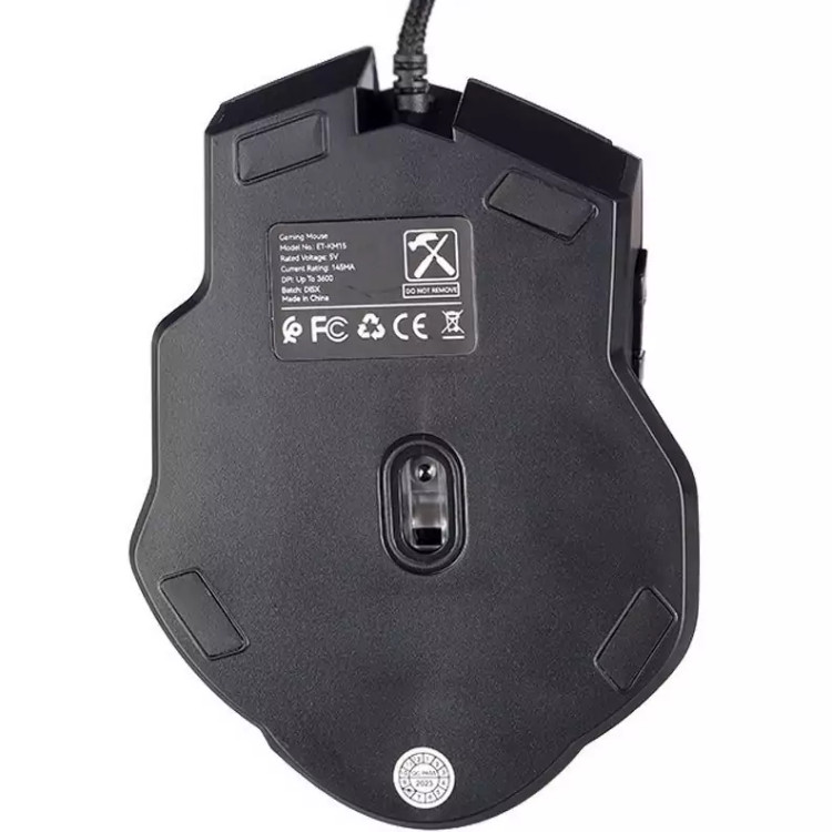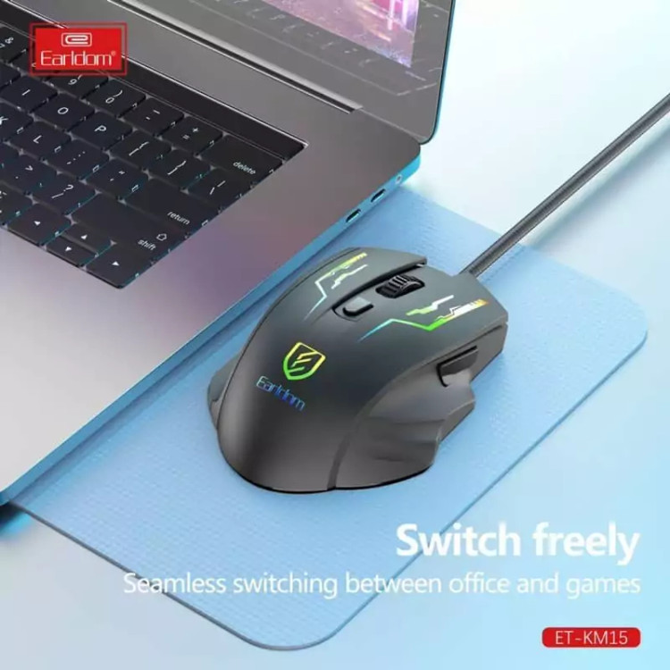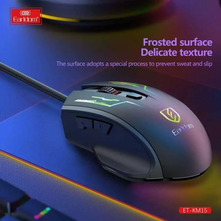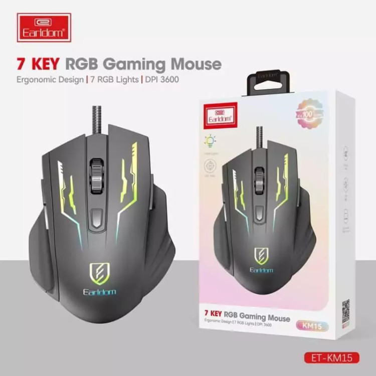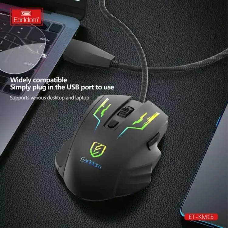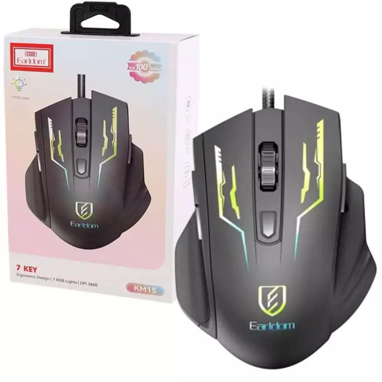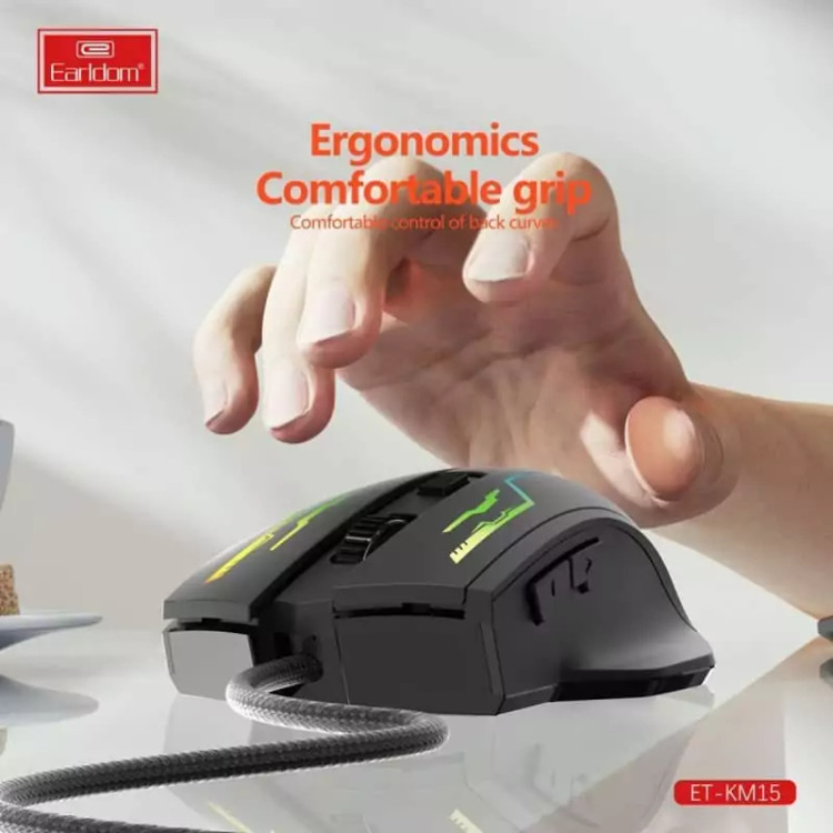 ماوس با سیم مخصوص بازی ارلدام مدل ET-KM15 دارای طراحی ارگونومیک، اتصال باسیم توسط رابط USB مجهز به حسگر اپتیکال با میزان دقت حداکثر 3600 نقطه بر اینچ دارای 7 عدد کلید فیزیکی با میزان ضربه پذیری 3 میلیون بار کلیک پشتیبانی از اتصال Plug And Play، دارای گواهی استاندارد CE/ FCC بدنه ساخته شده از متریال پلاستیک ABS مقاوم در برابر فشار و ضربه مجهز به نورپردازی RGB جهت ایجاد جلوه بصری زیبا در محیط کم نور و تاریک کابل به طول 1.5m با روکش کابل متصل از جنس الیاف بهم بافته شده، مقاوم در برابر گره خوردگی و پارگی