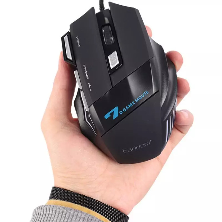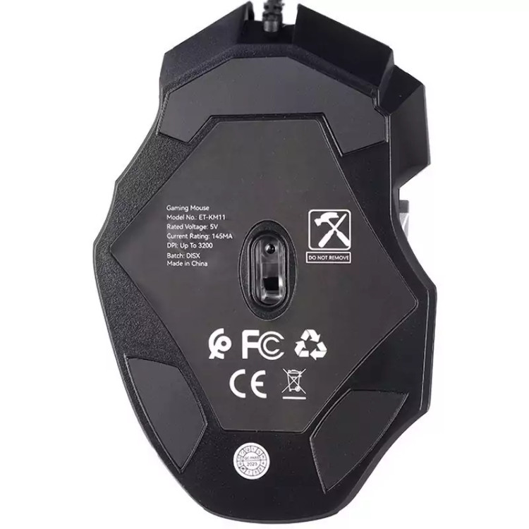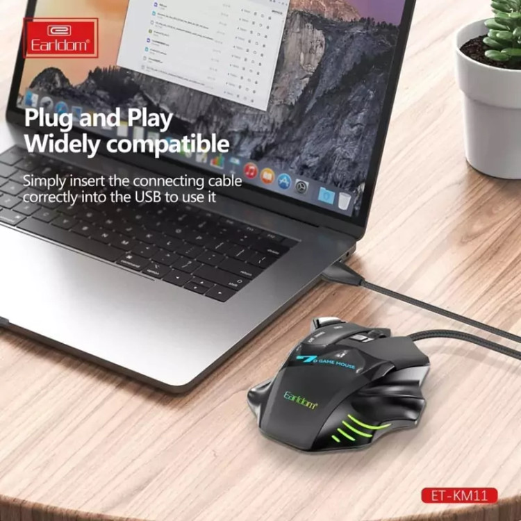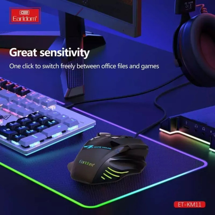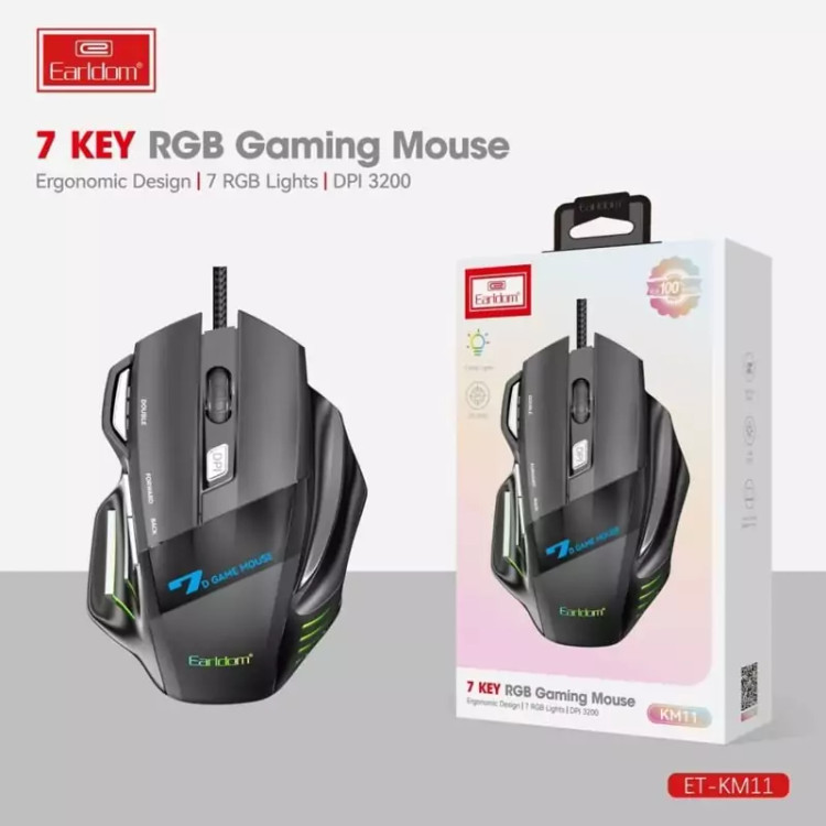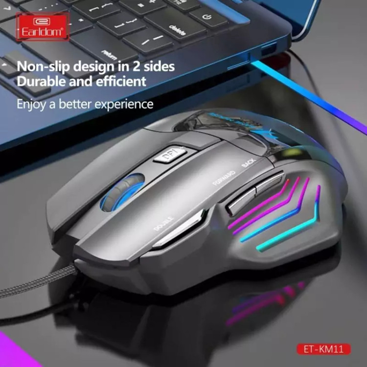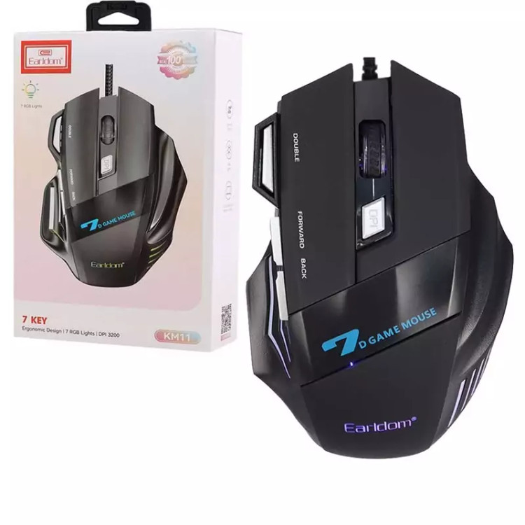 موس گیمینگ Earldom ET-KM11 ماوس با سیم مخصوص بازی ارلدام مدل ET-KM11 کابل KM11 به طول 1.5m با روکش کابل متصل از جنس الیاف بهم بافته شده است و بسیار مقاوم در برابر گره خوردگی و پارگی میباشد. همچنین مجهز به نورپردازی RGB جهت ایجاد جلوه بصری زیبا در محیط کم نور و تاریک نیز میباشد. بدنه ساخته شده از متریال پلاستیک ABS مقاوم در برابر فشار و ضربه و پشتیبانی از اتصال Plug And Play، دارای گواهی استاندارد CE/ FCC است. ماوس گیمینگ KM11 دارای 7 عدد کلید فیزیکی با میزان ضربه پذیری 3 میلیون بار کلیک و مجهز به حسگر اپتیکال با میزان دقت حداکثر 3200 نقطه بر اینچ نیز است . این ماوس خوش دست دارای طراحی ارگونومیک و اتصال باسیم توسط رابط USB است