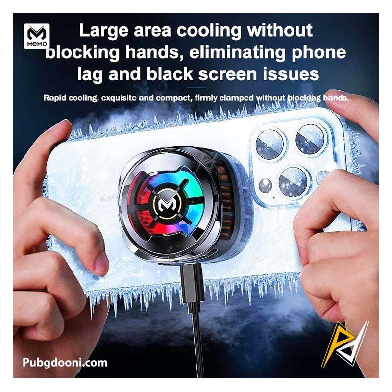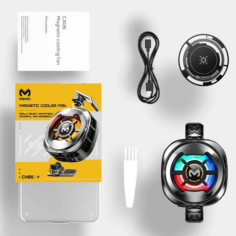 فن خنککننده انجمادی گوشی موبایل ممو مدل CX06، با بهره مندی از تکنولوژی یخچال نیمه هادی و هیت سینک رادیاتوری و مجهز به فن خنک کننده مغناطیسی به نحوی طراحی شده که در حین انجام کارهای سنگین و بازی هایی مانند کال آف دیوتی call of duty و پابجی PUBG خیال شما را از دمای گوشی موبایل تلفن همراهتان راحت کند. این فن خنک کننده هم مجهز به مگ سیف برای گوشی های دارای این قابلیت بوده و هم دارای صفحه فلزی دایره ای برچسب دار برای اتصال به گوشیها و تبلتهای بدون مگ سیف است همچنین این محصول دارای کلیپس هایی با لبه سیلیکونی و نرم است که به شما اجازه استفاده از آن برای هر مدل گوشی و تبلت را میدهد. این فن قدرتمند توسط کابل و شارژر 15 وات (آداپتور 5v-3a) خنک کنندگی بی نظیری برای حفاظت از گوشی شما بوجود میآورد. سرعت چرخش فن بیصدای آن 6000 دور در دقیق بوده و از RGB رنگارنگ حین استفاده بهره میبرد همچنین دارای دکمه تنظیم سه سطح قرت خنک کنندگی و روشن خاموش حین استفاده است. پک این محصول شامل یک دستگاه خنک کننده انجمادی CX06 به همراه کابل اتصال، صفحه مغناطیسی برچسبی و دو عدد کلیپس اتصال میباشد.